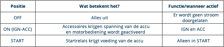 Dit contact laat toe dat de startmotor de motor rond laat draaien tot de sleutel los wordt gelaten waardoor het naar ON IGN-ACC teruggaat. Wanneer u de motor uit wilt schakelen, brengt u het contact naar de OFF-schakeling.